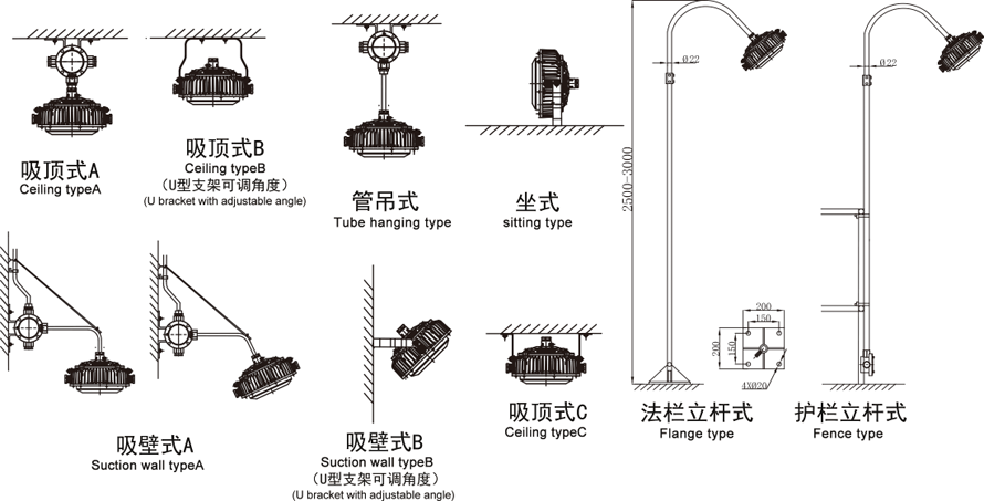 安裝方式:A:吸頂式  b:管吊式  c:吸壁式  d:法欄立桿式  e:護欄立桿式