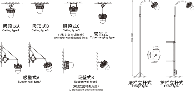 安裝方式:A:吸頂式 b:管吊式 c:吸壁式 d:法欄立桿式 e:護(hù)欄立桿式