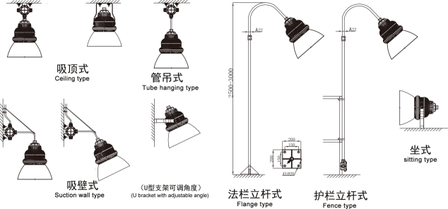 安裝方式:A:吸頂式 b:管吊式 c:吸壁式 d:法欄立桿式 e:護(hù)欄立桿式